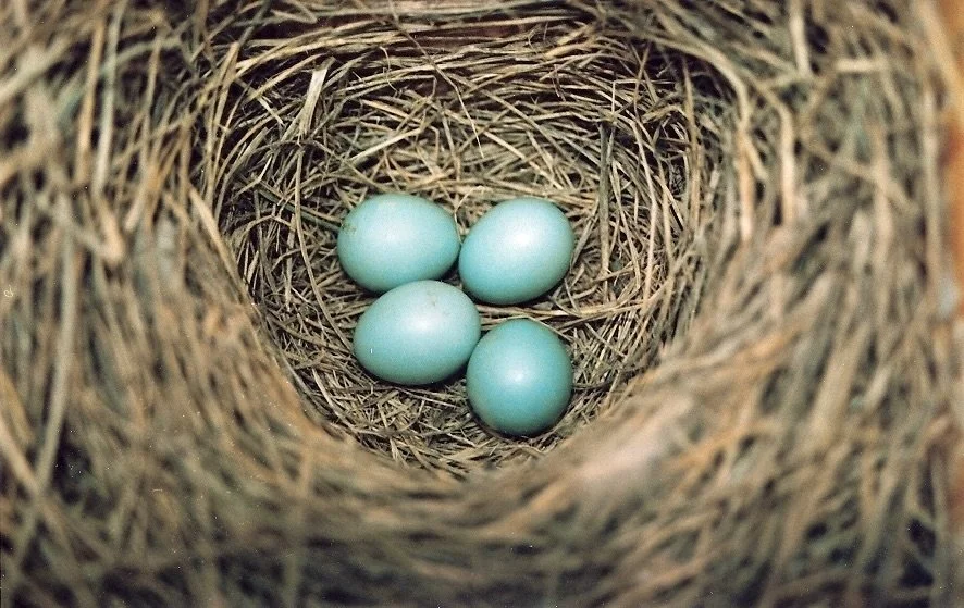When the females arrive, typically later than the males, a male woos a female by singing for her and waving his wings. Once a female selects a mate, he guards the nest site while she constructs a nest made of grass. She lays two to seven sky-blue eggs and incubates them for at least 14 days. She broods the nestlings while her mate delivers crickets, moths, spiders, and other insect food.