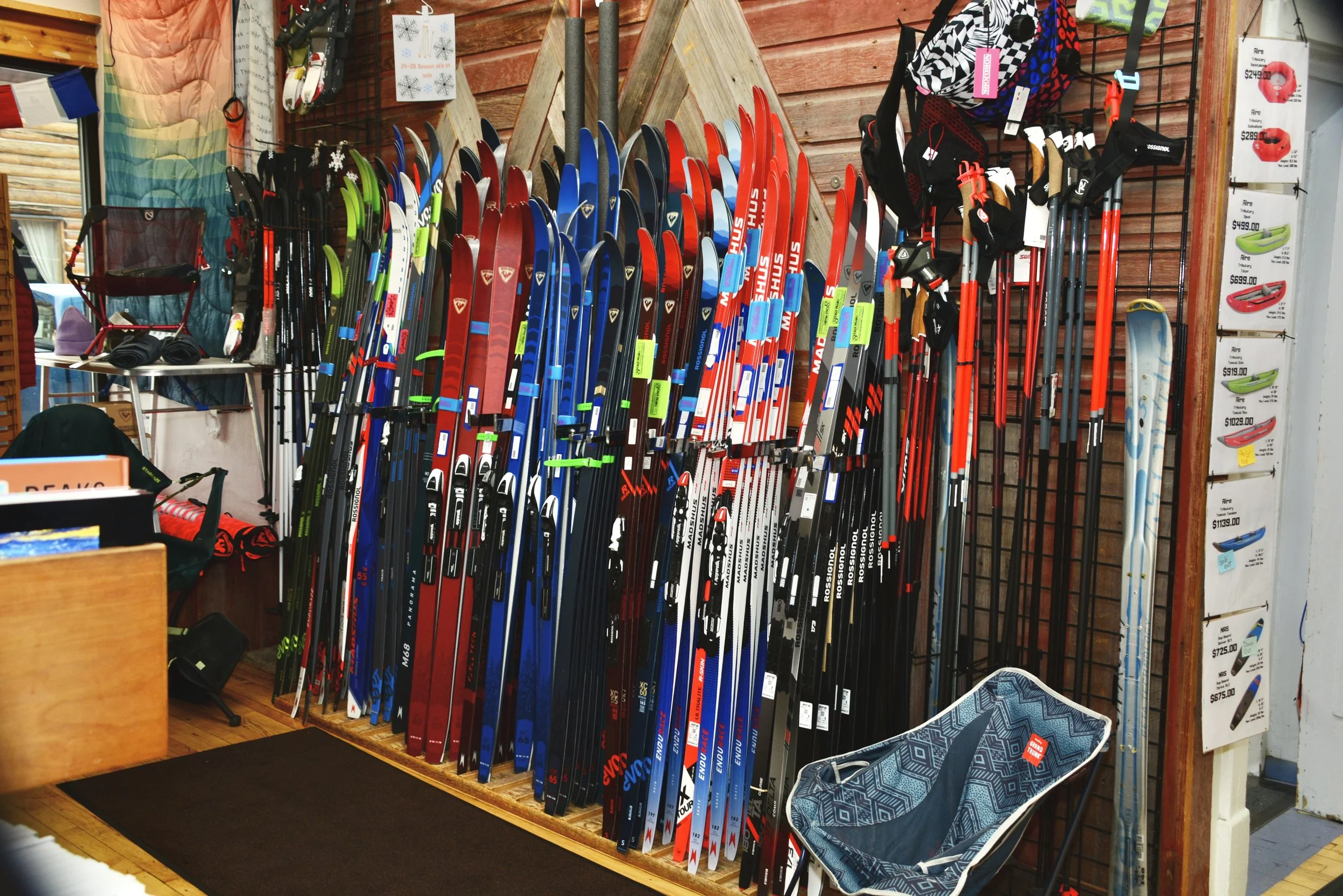 Small when compared to big city sporting goods stores, Marci, Mike and their crew make the most of their space. Nordic skis are displayed up front, colorful hammocks and sleeping bags hang from the ceiling, and clothing is displayed on racks throughout the store. The selection of warm winter hats is the best you’ll find anywhere. Shoes and boots, a selection of backpacks, climbing gear, and freeze-dried meals are available downstairs.