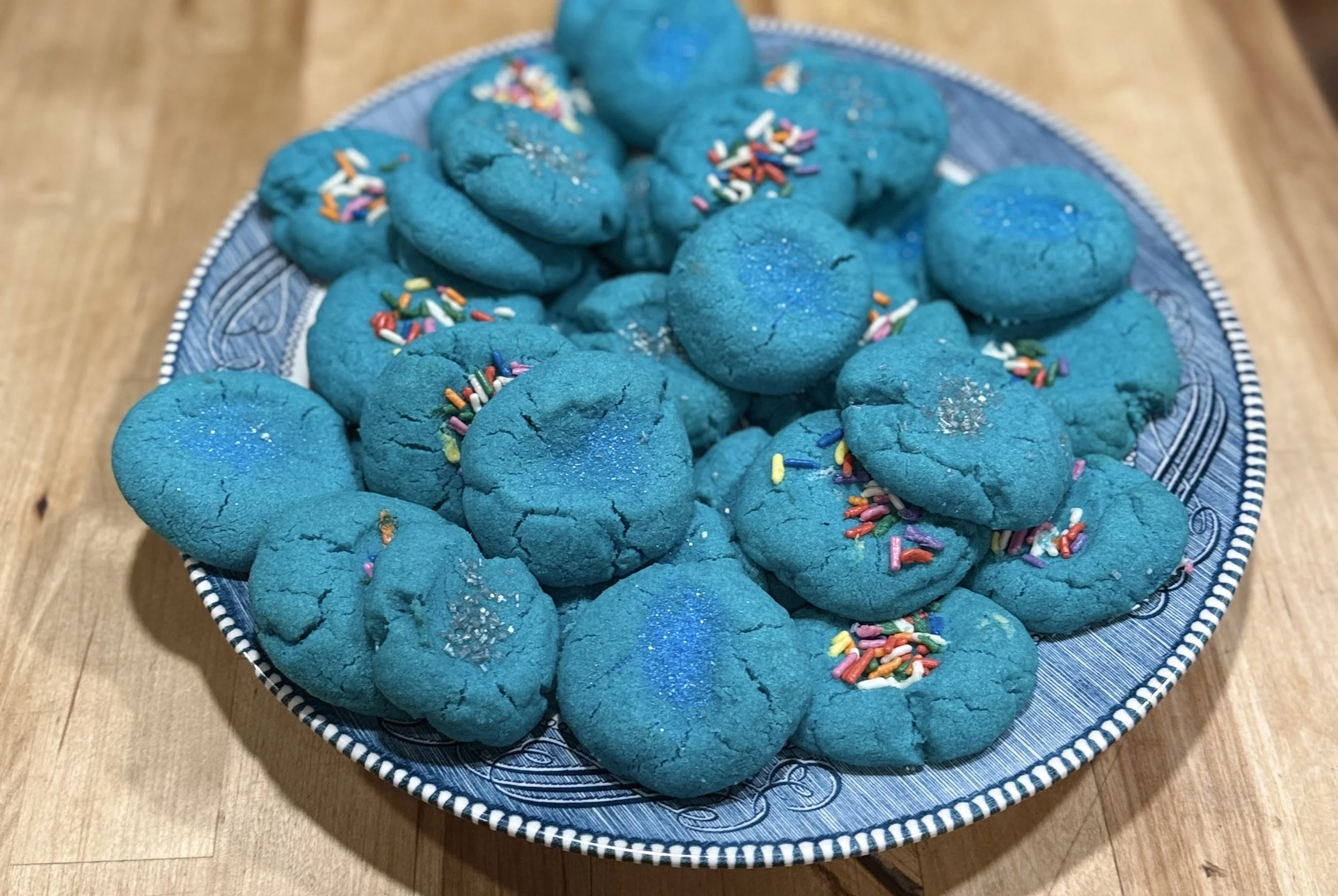 Preheat the oven to 375 degrees. Grease cookie sheets. Cream the shortening and sugar. Beat in the eggs, almond extract. (For colored cookies, add several drops of preferred color). Sift dry ingredients, then gradually blend those in and mix well. Fill a cookie press or form the cookies into a ball-push the center in with a finger and add sprinkles to the top. Bake for 10-12 minutes. Remove and cool on baker’s racks. Makes about 6-7 dozen.