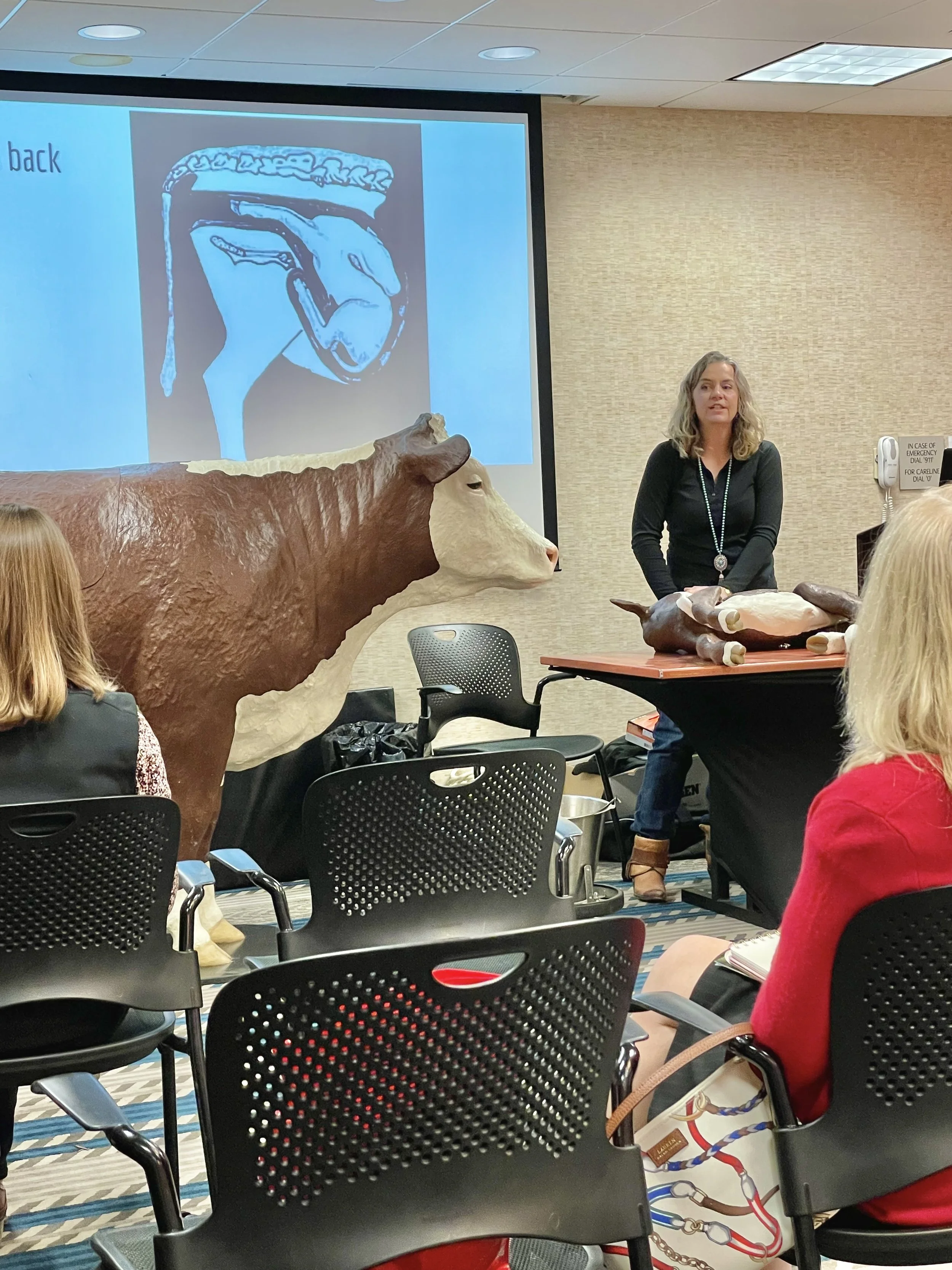 “Stella is our traveling bovine, and she’s very realistic,” she said, “We try to teach ranchers things they can do on their own to avoid calling a vet, but also to know when it’s absolutely necessary to call. Ranchers learn a lot from it.”